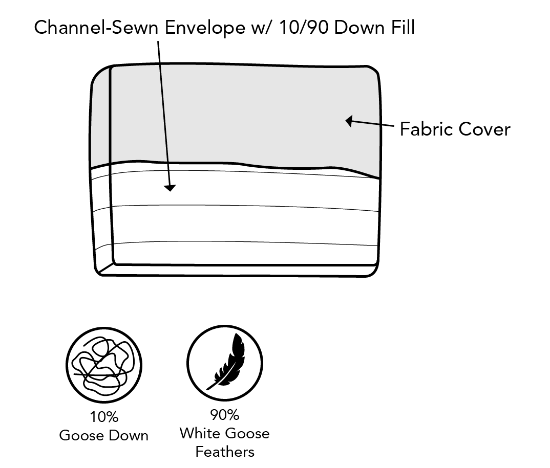 Our 10/90 Down option features 10% goose down and 90% white goose feather filling. It is encased in a down-proof channel-sewn envelope to minimize sagging or shifting. Please note that it is normal for some feathers to escape even though the cover we use is of the highest quality. Feathers and down are prewashed at our vendor to reduce dander. 10/90 Down has slightly more structure and firmness than the synthetic Trillium option. All back pillows require regular fluffing and rotating to maintain their shape.