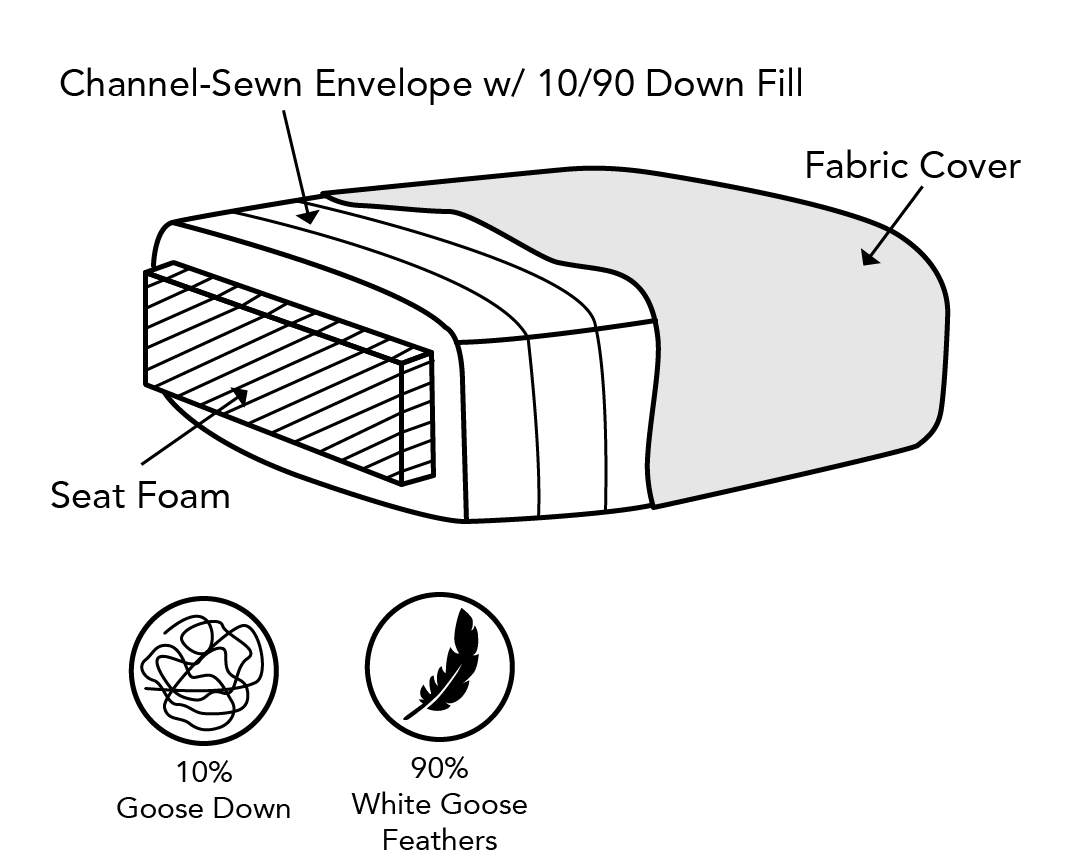 Our 10/90 Down Blend option features 10% goose down, and 90% white goose feather filling. It is encased in a down-proof channel-sewn envelope surrounding the selected foam core. Please note that it is normal for some feathers to escape even though the cover we use is of the highest quality. Feathers and down are prewashed at our vendor to reduce dander. 10/90 Down Blend has slightly more structure and firmness than the synthetic Trillium option. Note that this cushion requires reqular flipping and fluffing to maintain its appearance.