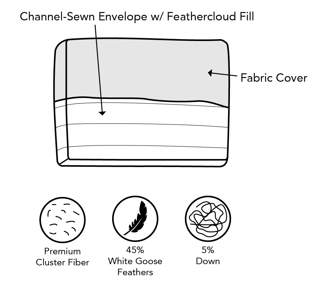 Feathercloud is a combination of a premium cluster fiber and a blend of 5% down & 45% white goose-feathers. The back pillow insert is encased in a channel-sewn cover to minimize sagging or shifting. Feathercloud offers more structure and slightly more firmness than the synthetic Trillium option. All back pillows require regular fluffing and rotating to maintain their shape.