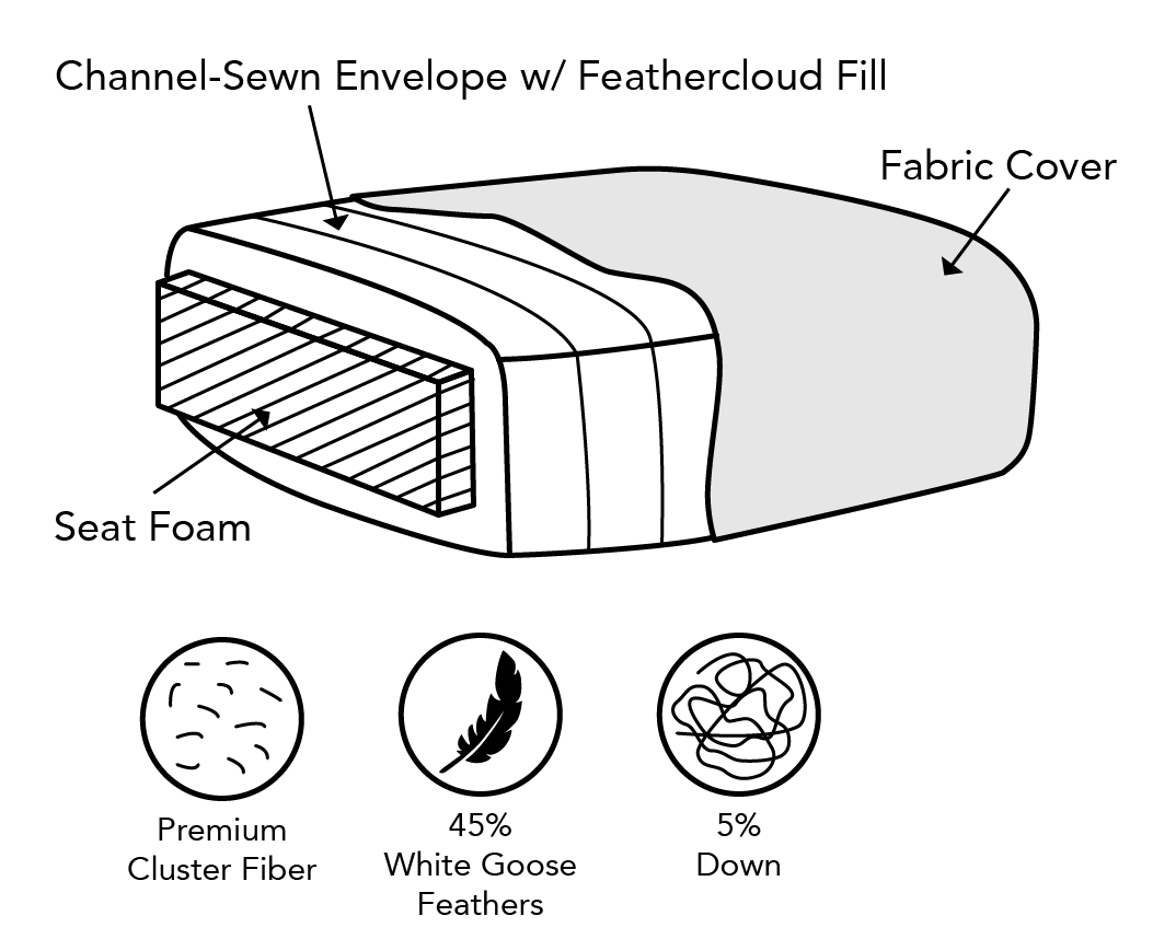 Feathercloud is a combination of a premium cluster fiber and a blend of 5% down & 45% white goose-feathers. It is encased in a channel-sewn envelope surrounding the selected foam core. Feahercloud provides slightly more loft and structure than the synthetic Trillium option, yet it is still more luxurious in feel than the Standard Fiber wrap. Note that this cushion requires reqular flipping and fluffing to maintain its appearance.