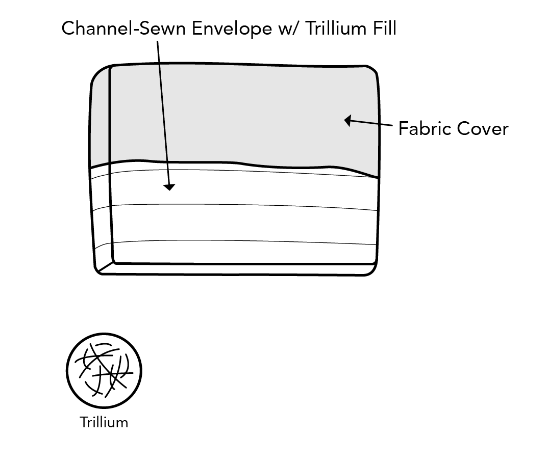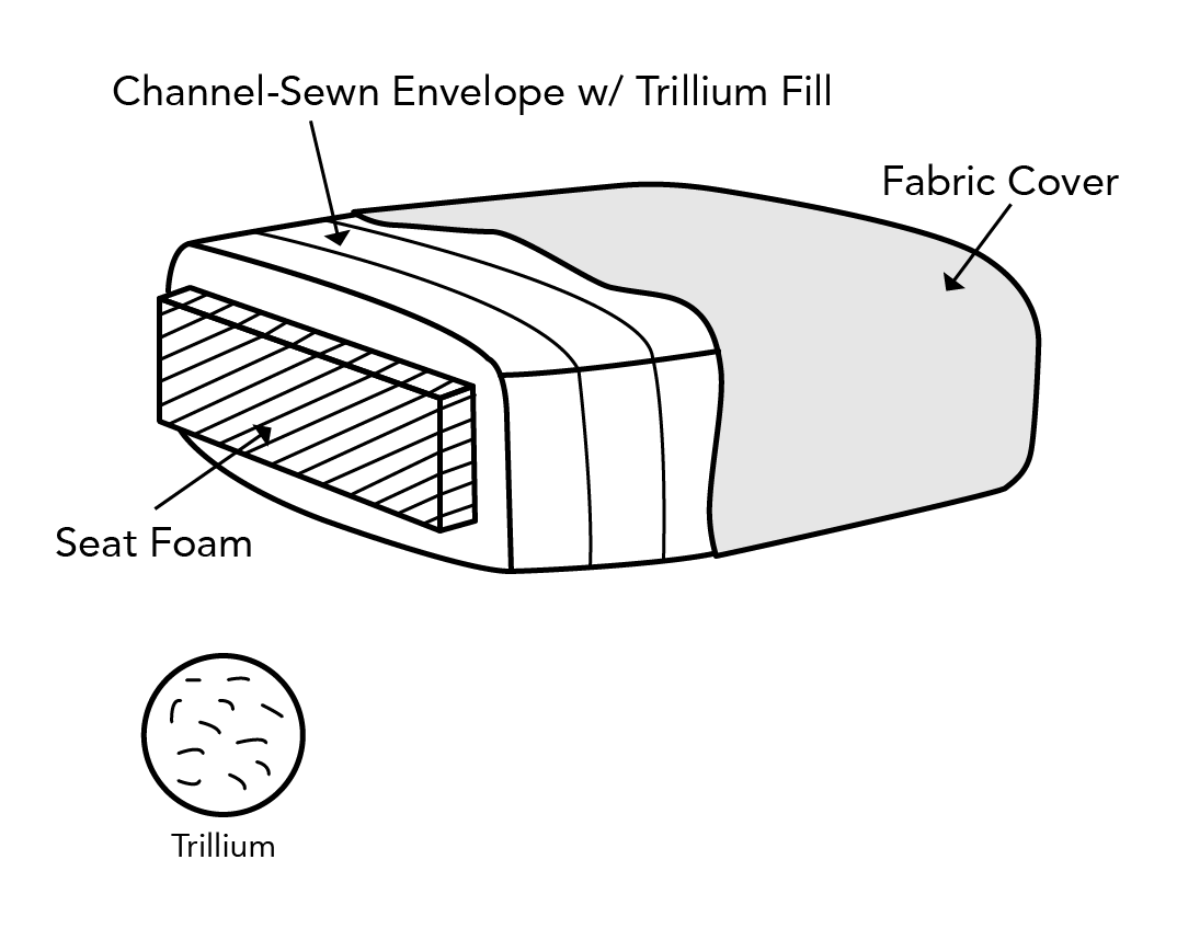 Trillium is a synthetic alternative to our Feather & Down option. It is made of a super slick polyester premium fiber that mimics the weight and feel of a natural Feather & Down fill. We recommend this option for those that are allergic to feathers, but still want the luxurious feel of a feather/down option that our basic Standard Fiber wrap does not provide. The seat consists of the chosen foam core, but instead of the two layers of Polyester Fiber wrap, it is surrounded by a channel-sewn envelope filled with Trillium. Note that this cushion requires reqular flipping and fluffing to maintain its appearance.